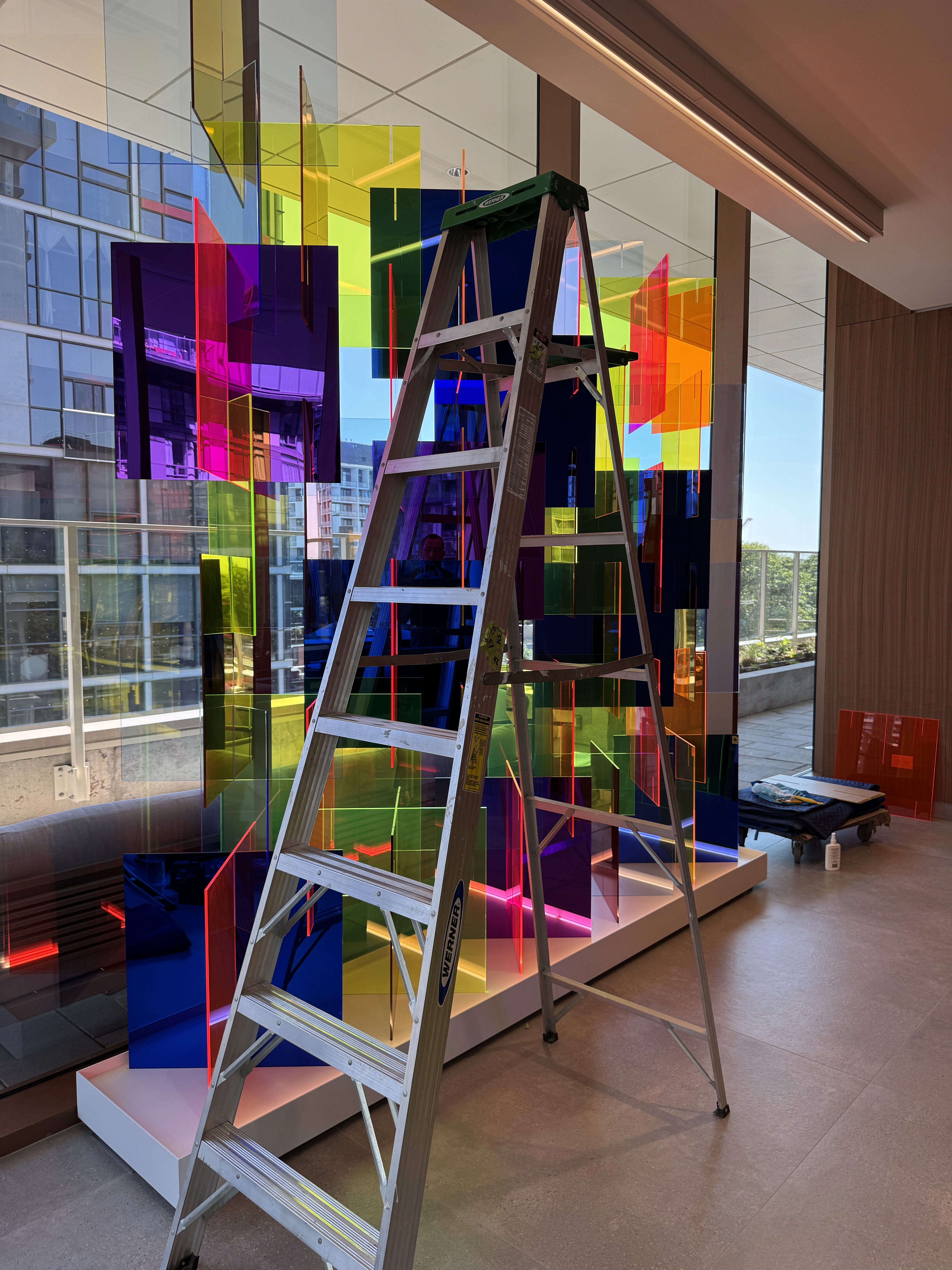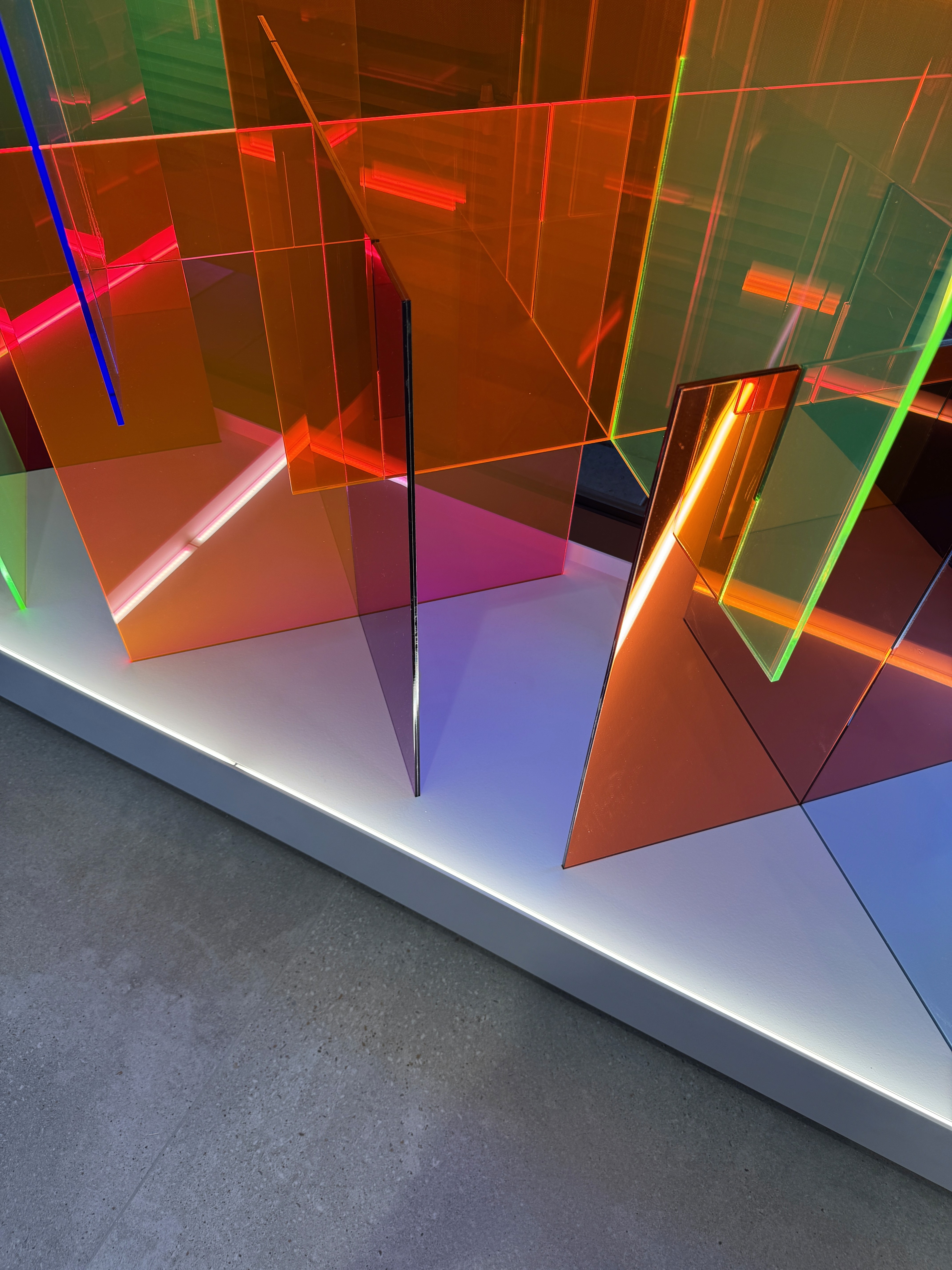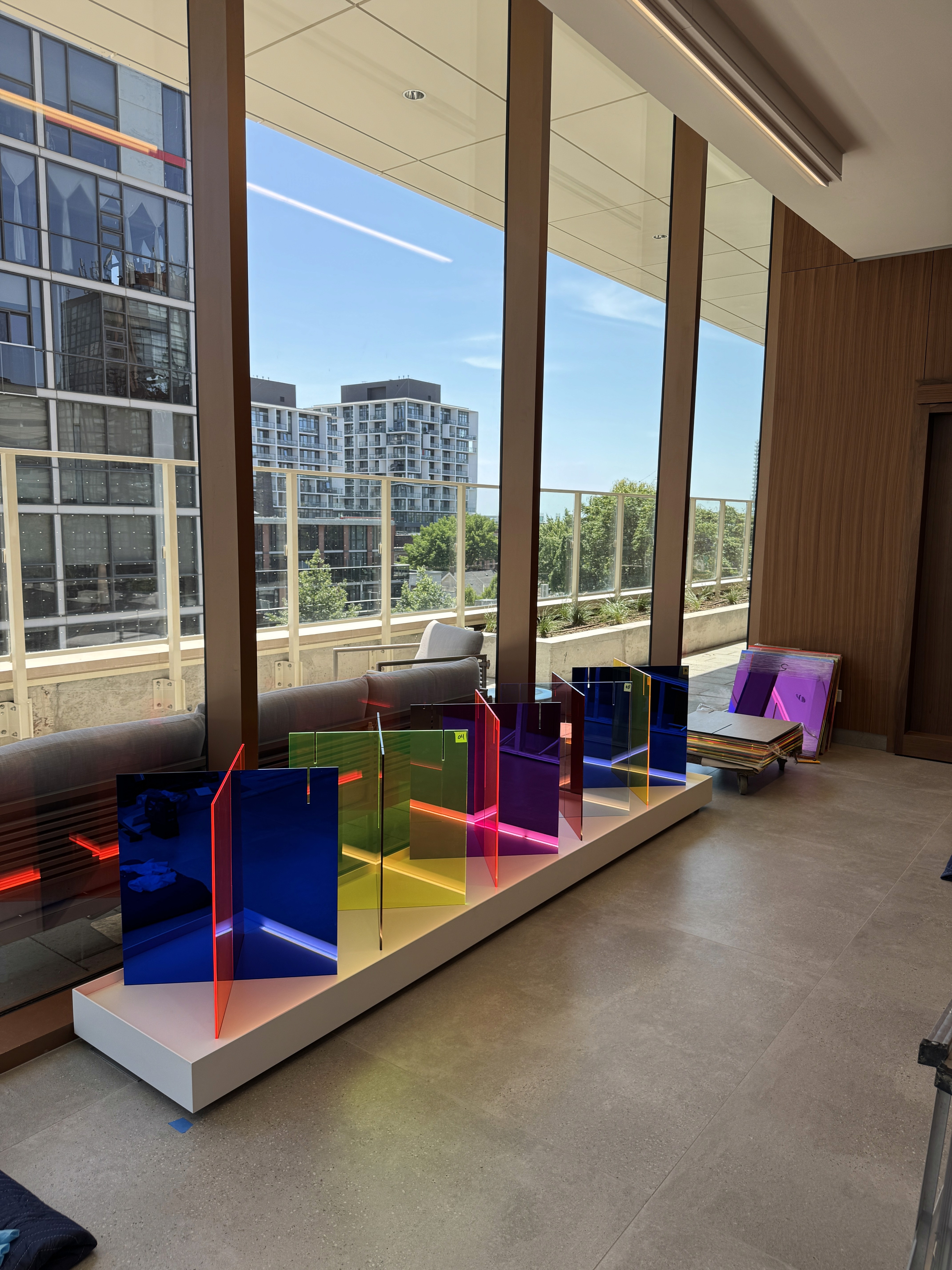 Custom 10'x12' sculpture in fluorescent and mirrored acrylic on a custom metal plinth with integrated LED lighting. Lighting developed to suit the install location through renderings and full scale lighting studies. Design engineering, prototyping, fabrication, and installation by Interproject.