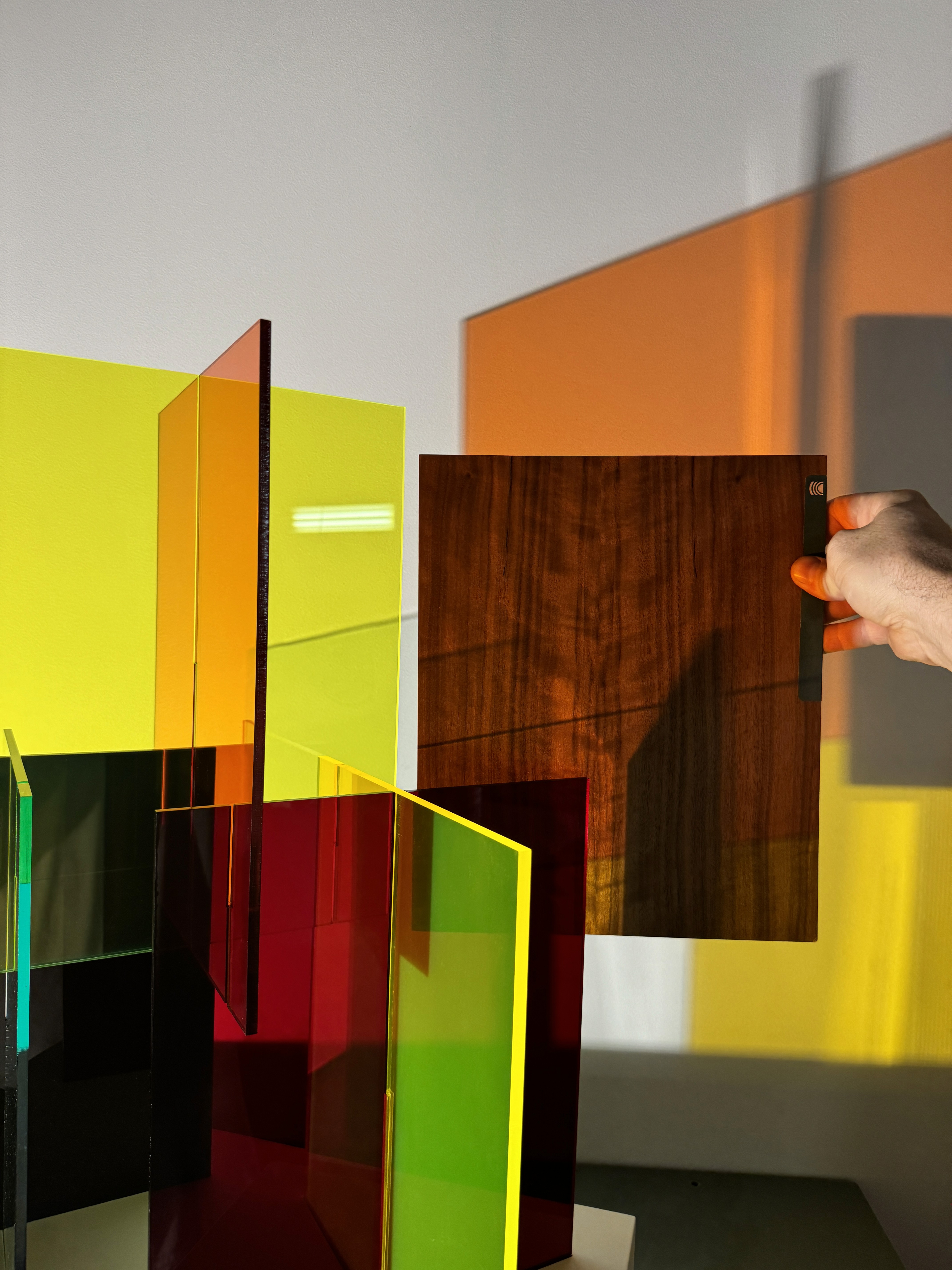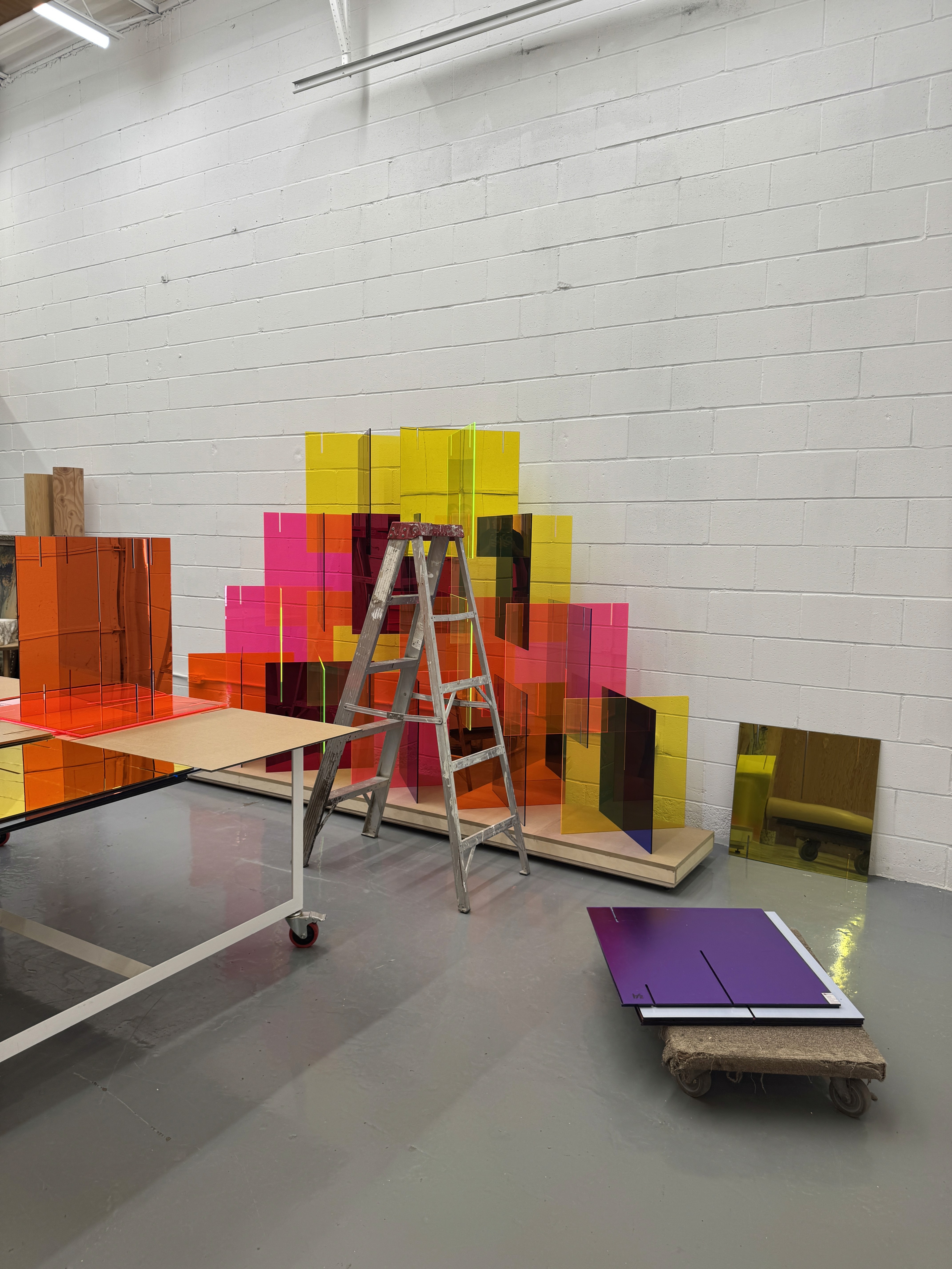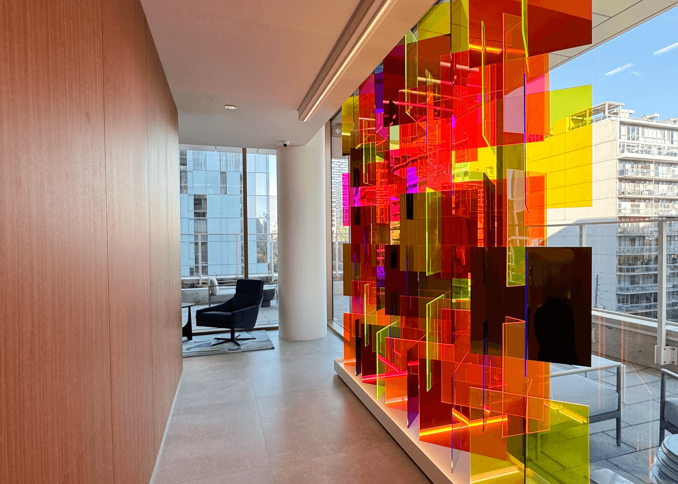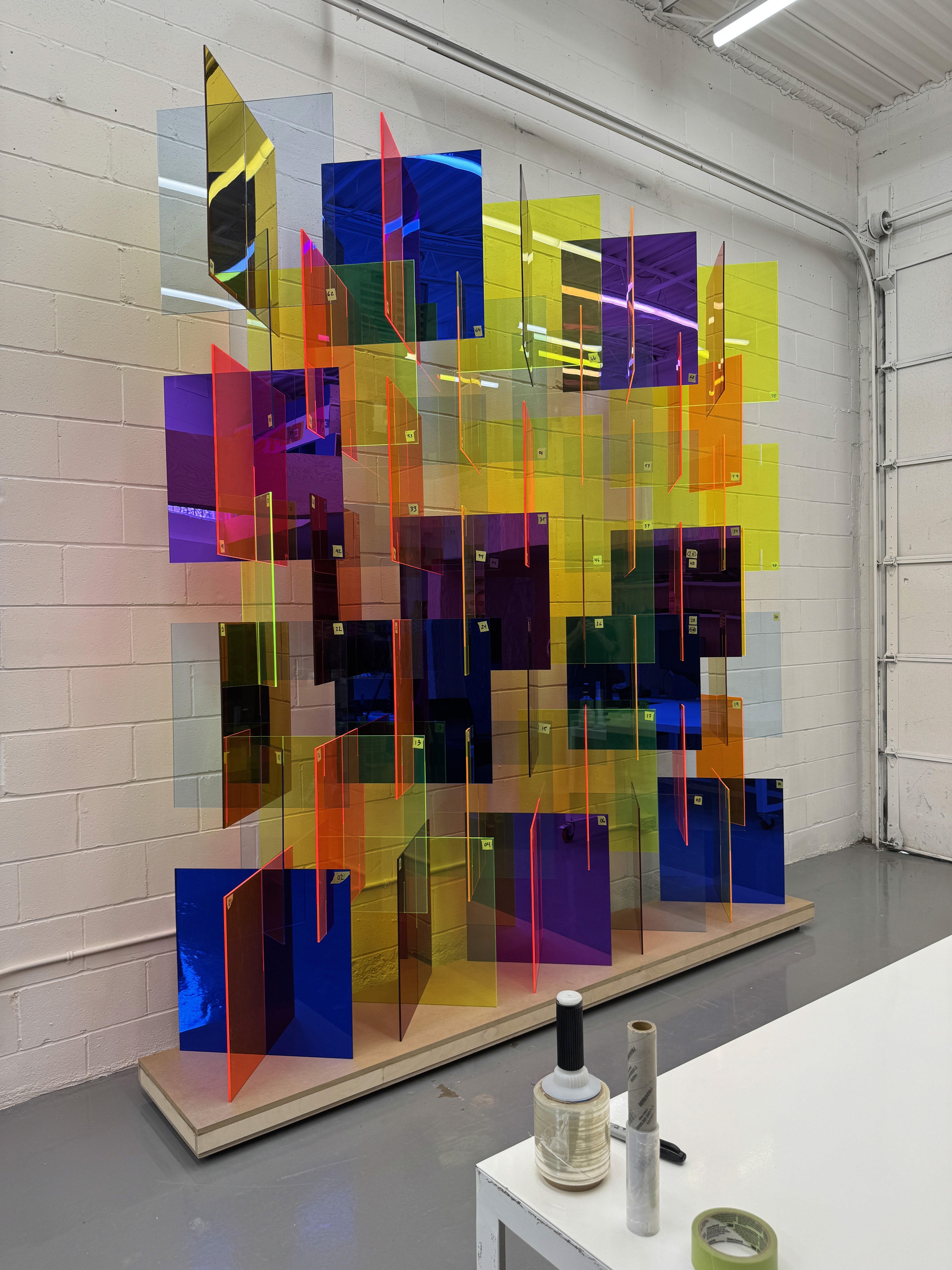 Custom 10'x12' sculpture in fluorescent and mirrored acrylic on a custom metal plinth with integrated LED lighting. Lighting developed to suit the install location through renderings and full scale lighting studies. Design engineering, prototyping, fabrication, and installation by Interproject.