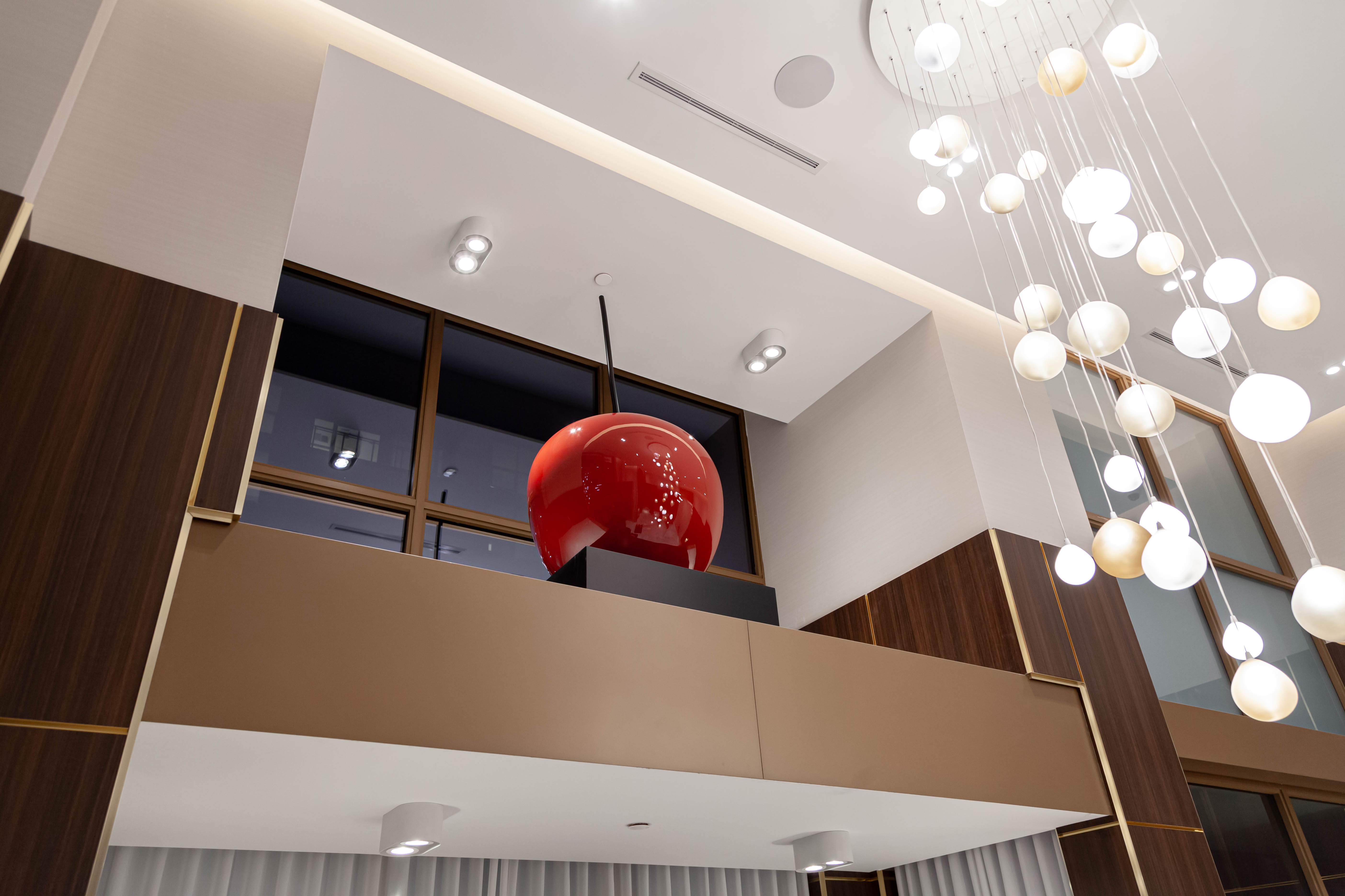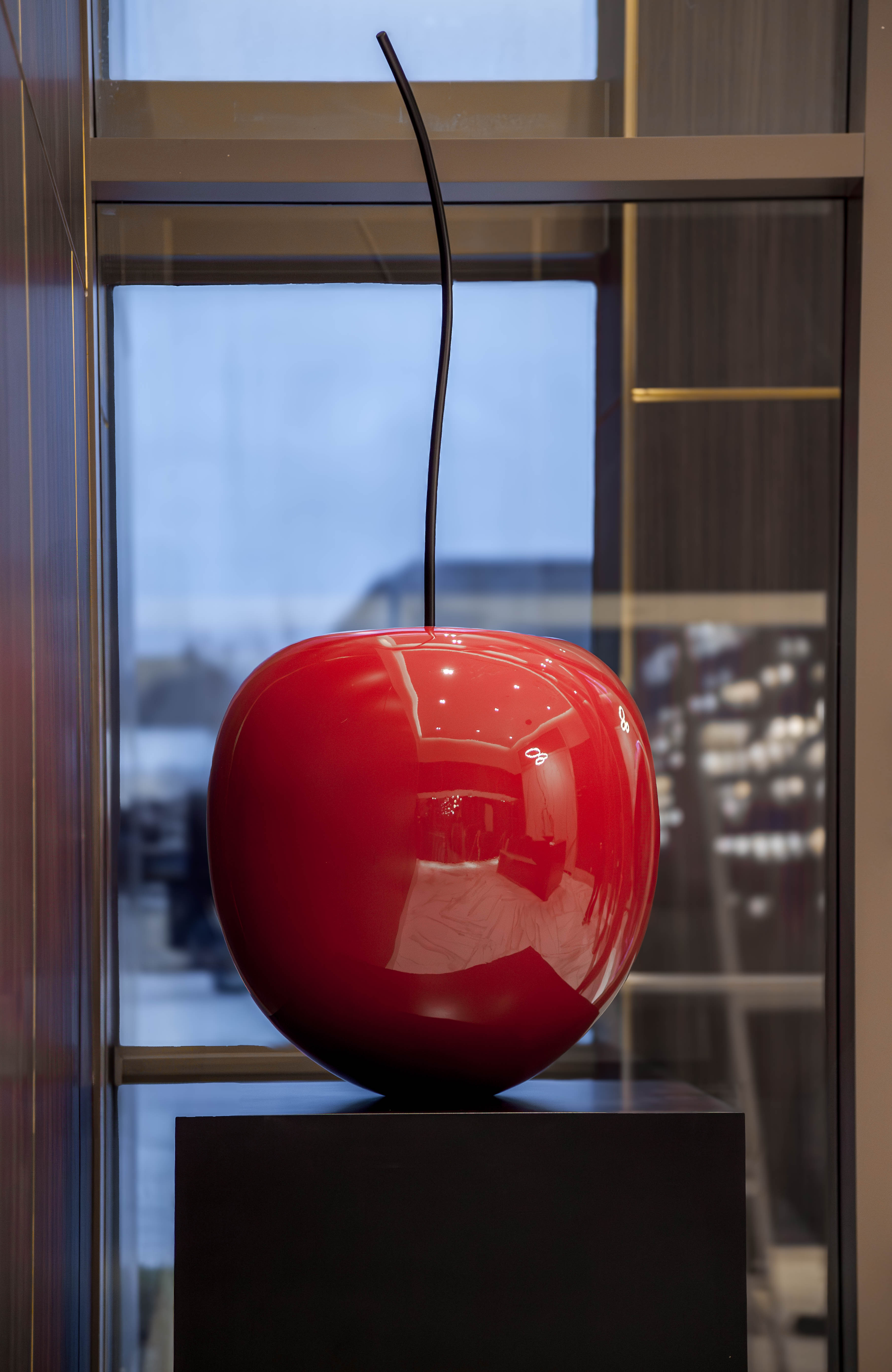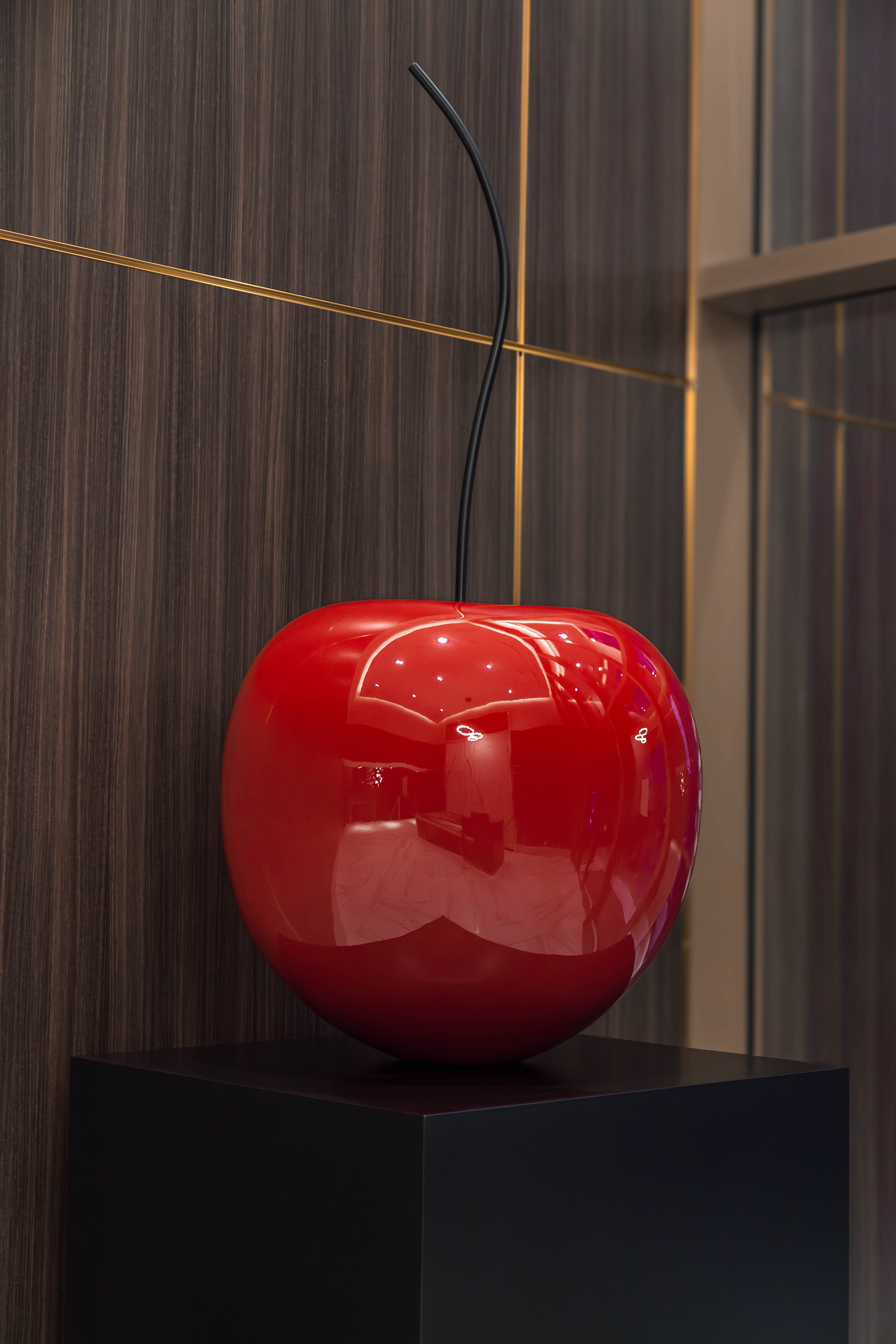 Two hand carved foam cherries in a high gloss lacquer finish. Concept and photography by Studio Alvo / Stephanie Sannuto. Fabrication and installation by Interproject.