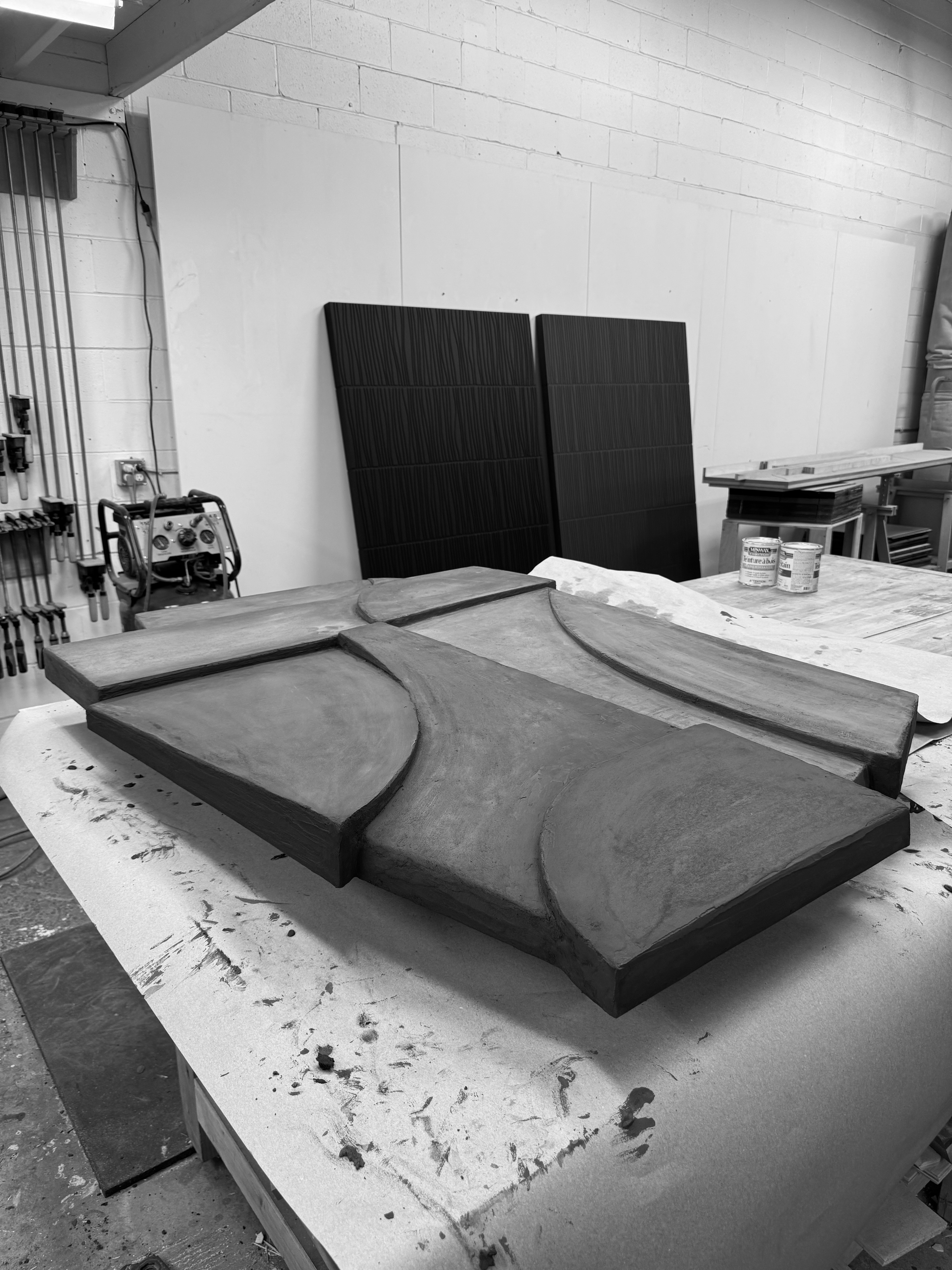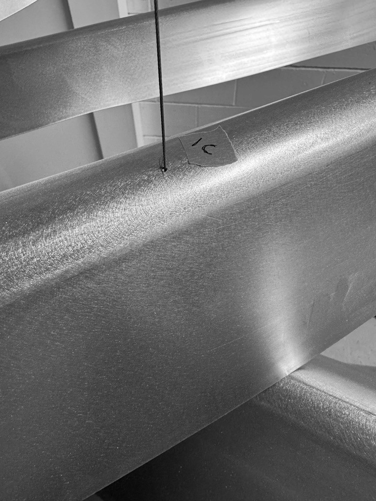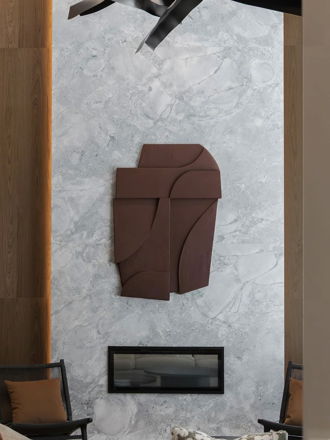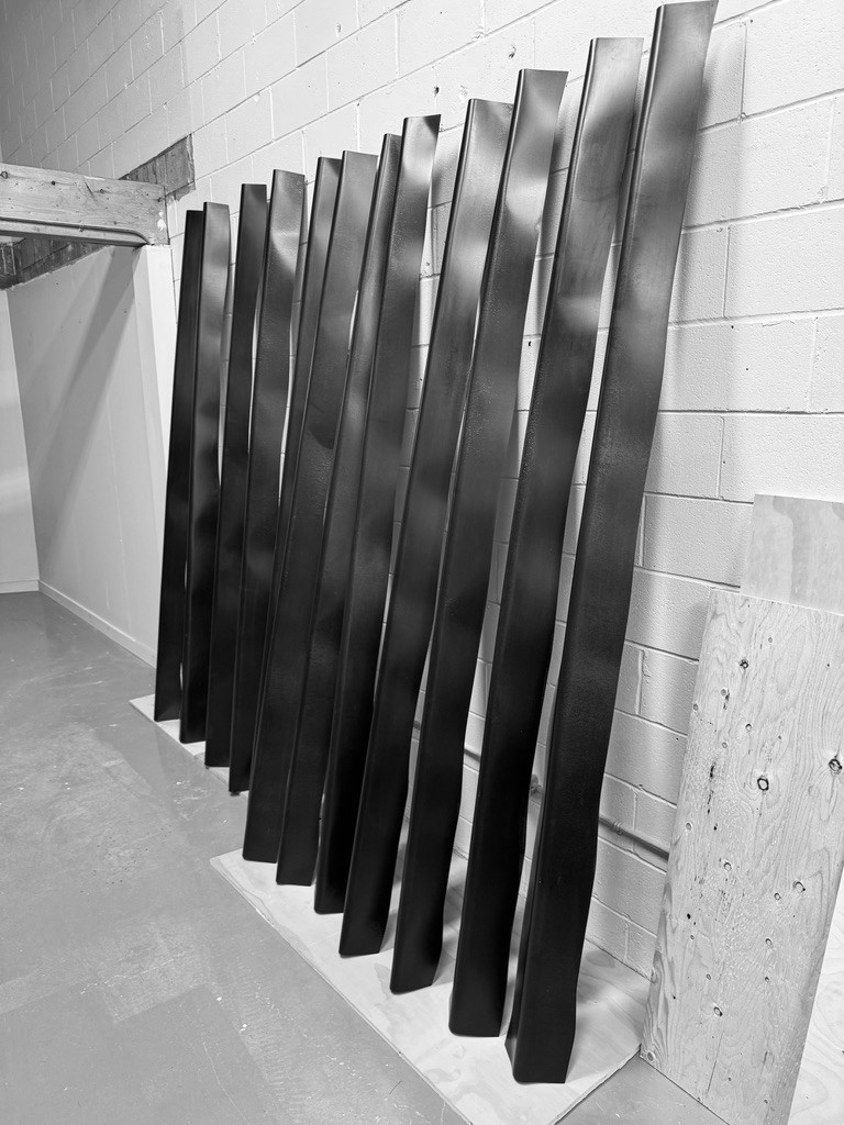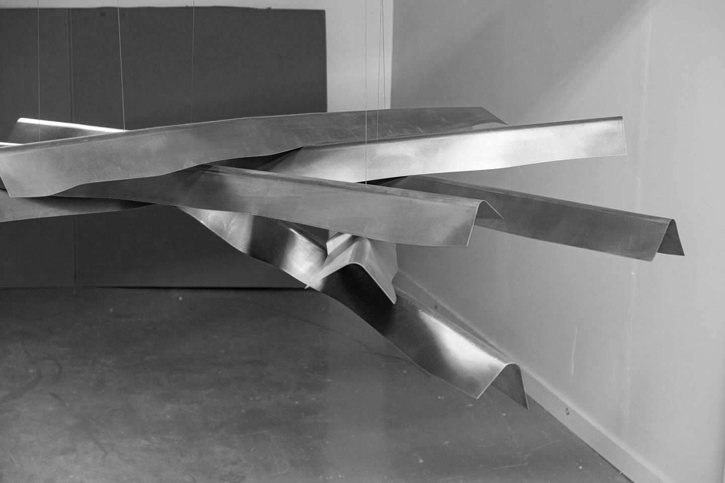 Two custom 12' wide suspended metal sculptures in hand bent steel with a custom patina finish. Each sculpture was mocked up at full scale in our Toronto facility to help the project team find the most dynamic composition that also minimized the braided steel cable hang points. Concept and photography by Studio Alvo / Stephanie Sannuto. Design engineering, prototyping, and fabrication by Interproject.