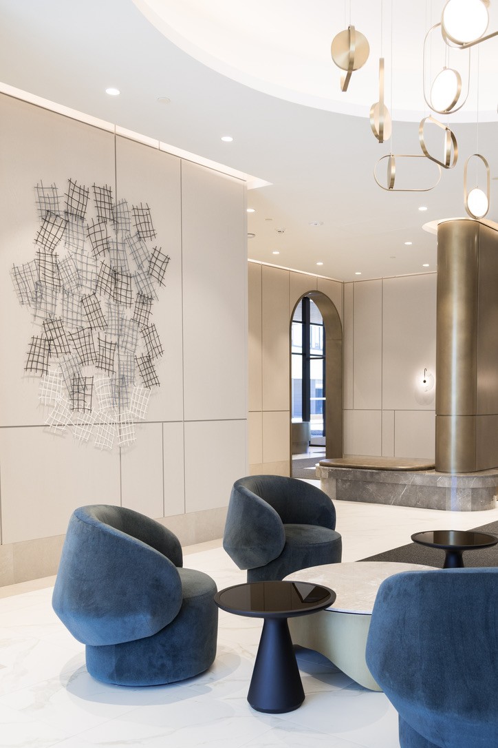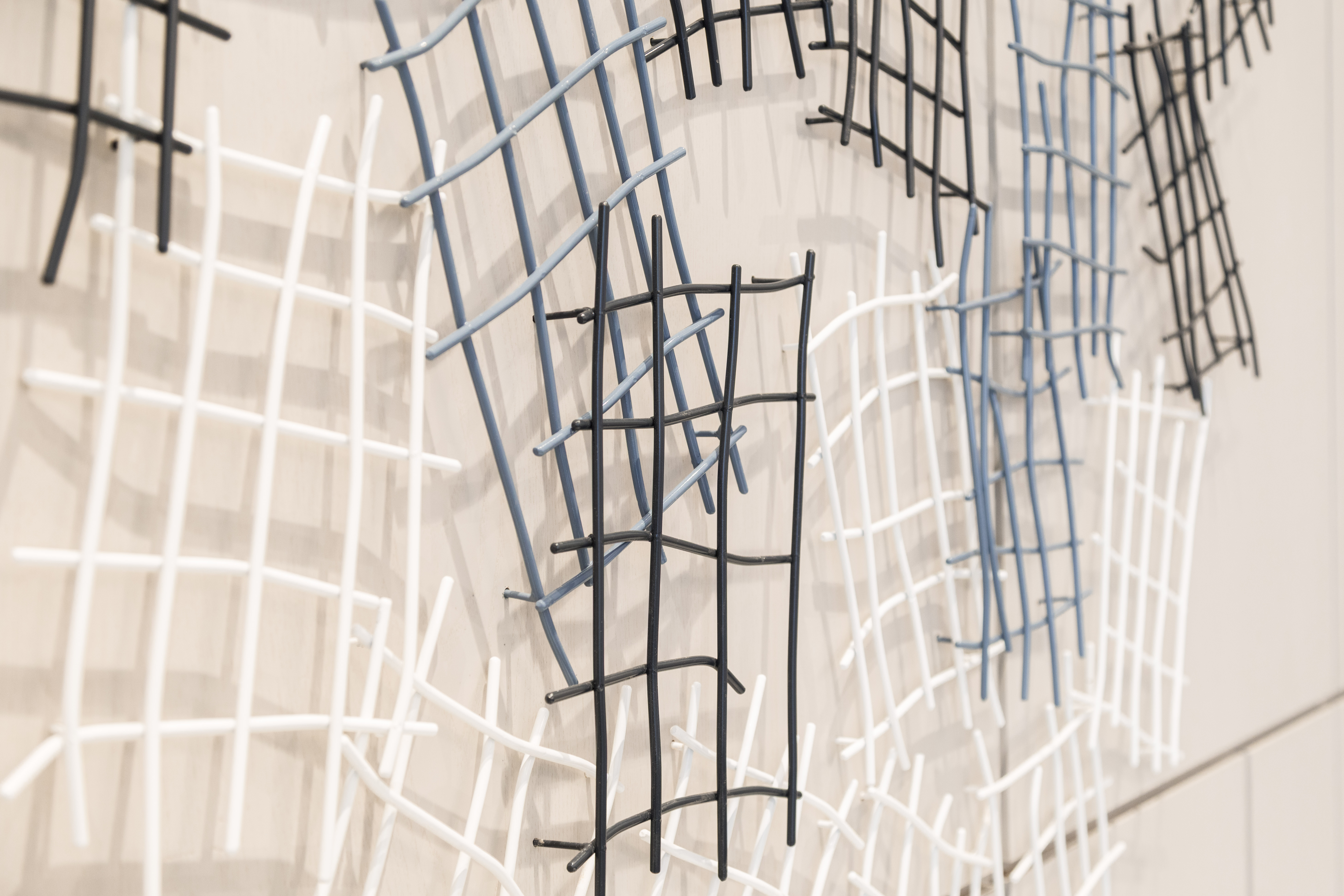 Layered wall sculpture custom fabricated from hand bent and welded steel rod in a custom gloss paint finish. This sculpture was designed by Interproject to mount discretely into the base building millwork wall panels. Concept and photography by Studio Alvo / Stephanie Sannuto. Design engineering, fabrication, and installation by Interproject.